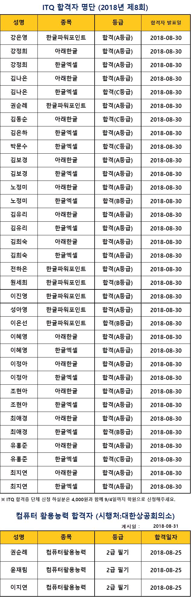2018년 8회 ITQ합격자 발표 외 (2018.8.31.)