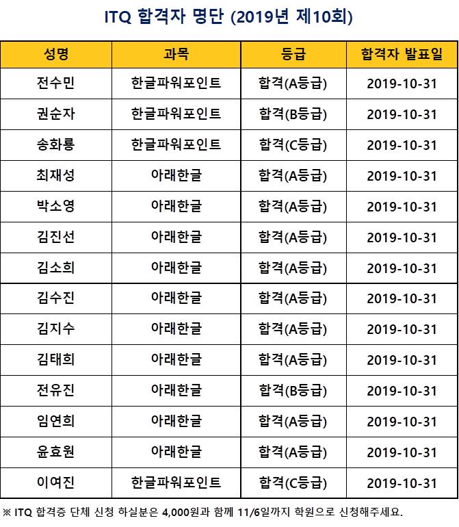 2019년 제10회 ITQ합격자 발표 (2019-10-31)