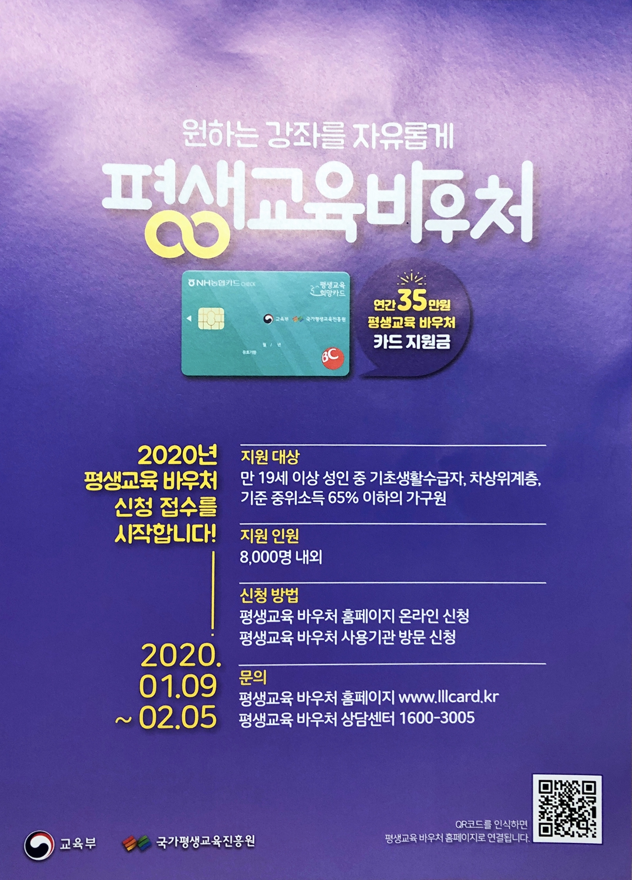 평생교육 바우처 카드 2020년 신청은 2월 5일까지 입니다.