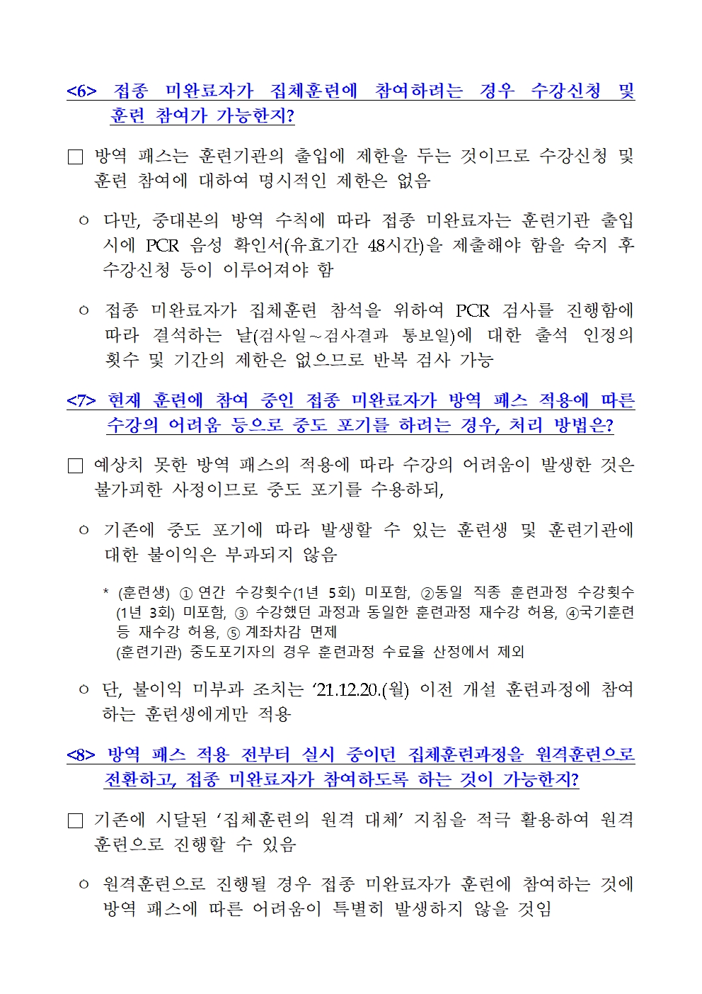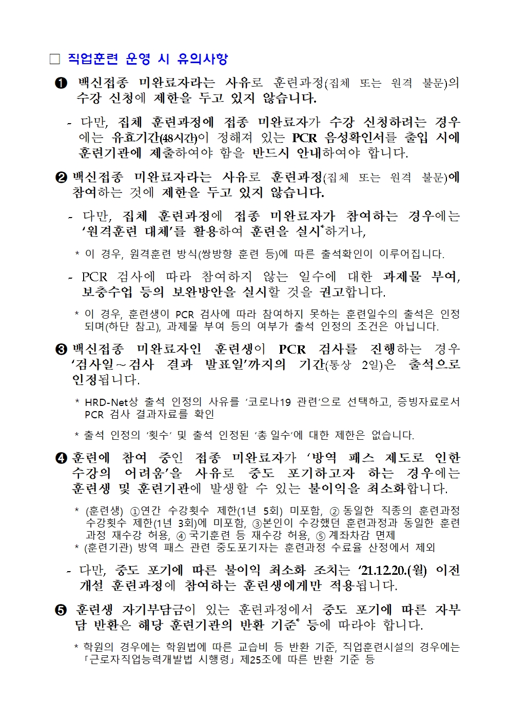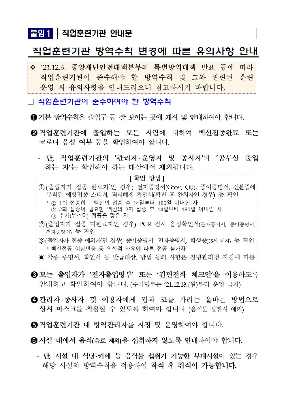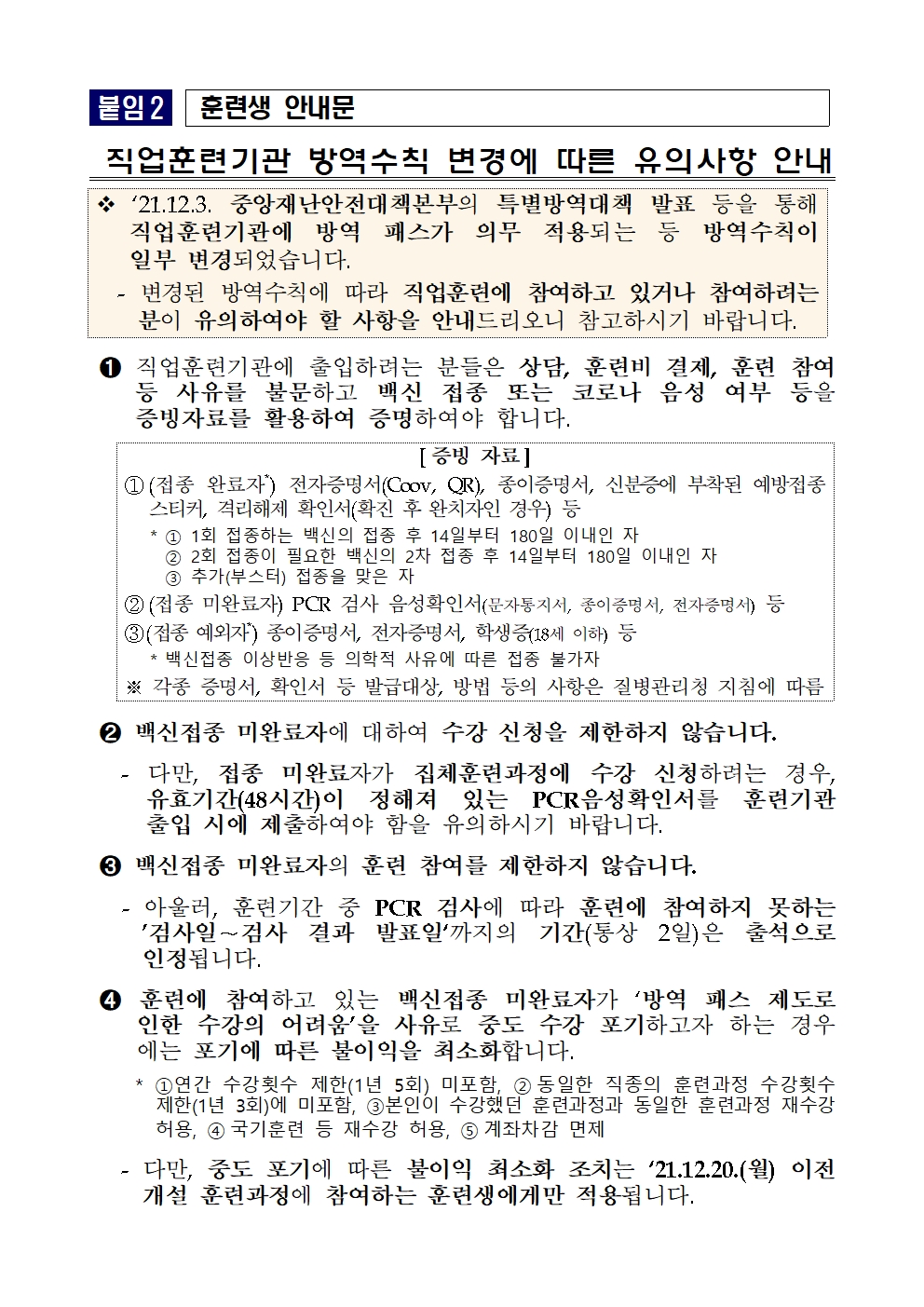 학원 방역수칙 변경사항 훈련생 안내문